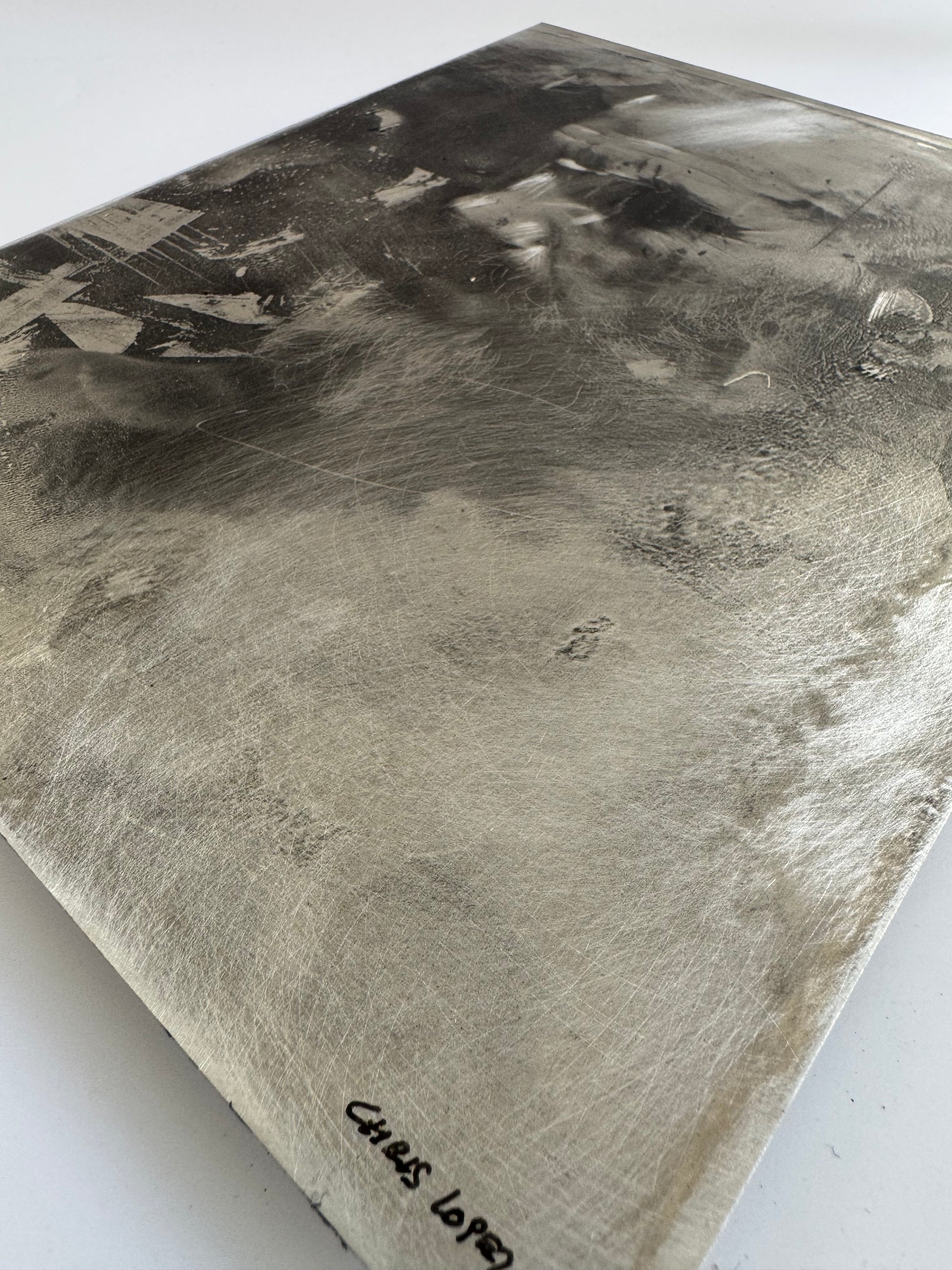 One-of-a-kind artisan print meticulously applied by hand onto an aluminum panel, measuring 8 by 10 inches. The previously distressed surface enhances the depth and richness of the image, ensuring each piece is a distinctive unique reproduction. Delivered unframed, it is ready to hang immediately.