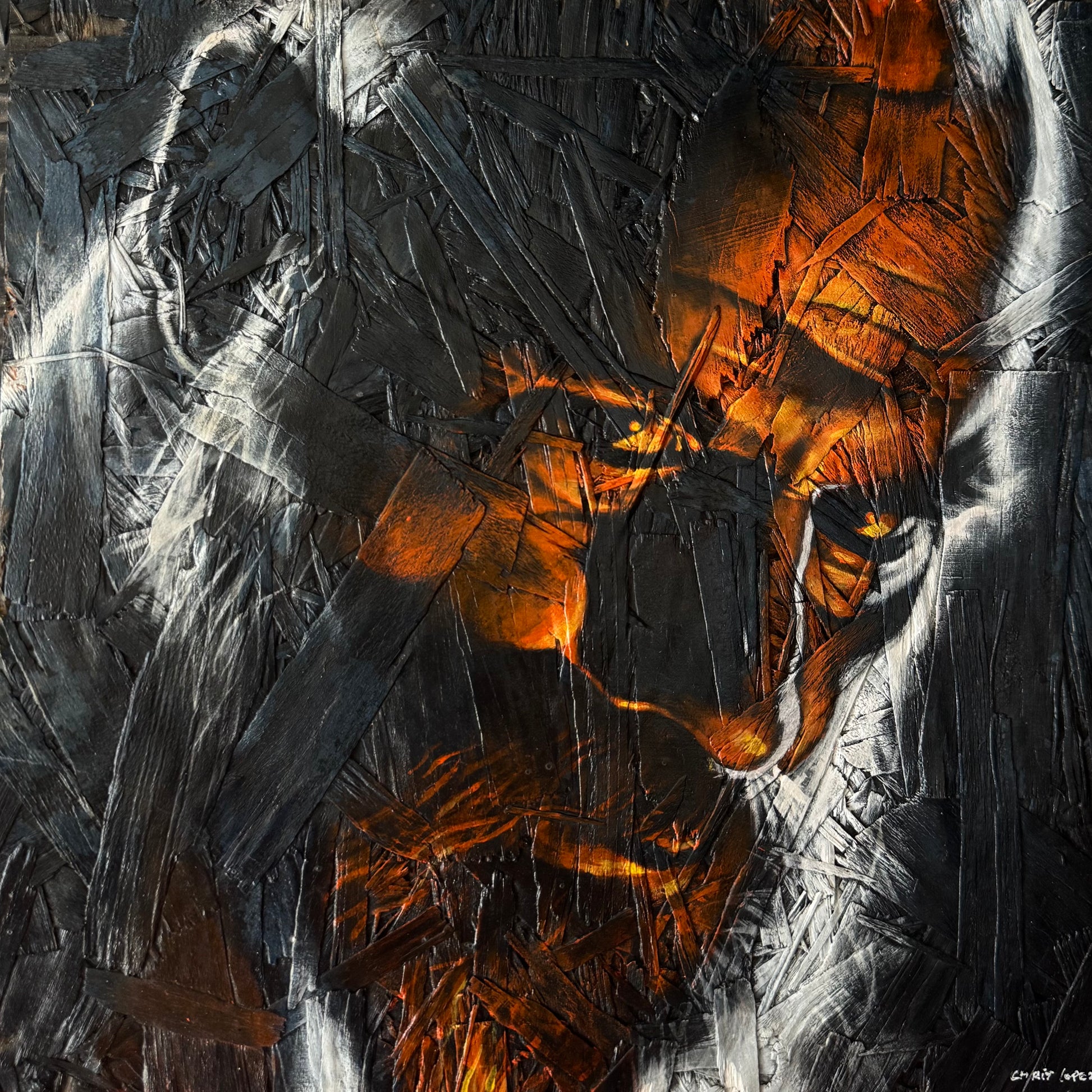 "Obscure" is part of a refined series exploring raw, expressive portraits without photographic references. Crafted on dark-tinted OSB panels, each piece emphasizes rugged textures and dramatic stares, enhancing contrast and depth through the panel’s inherent darkness. This technique highlights the emotional intensity and adds a striking interplay of light and shadow, in these evocative, tactile works.