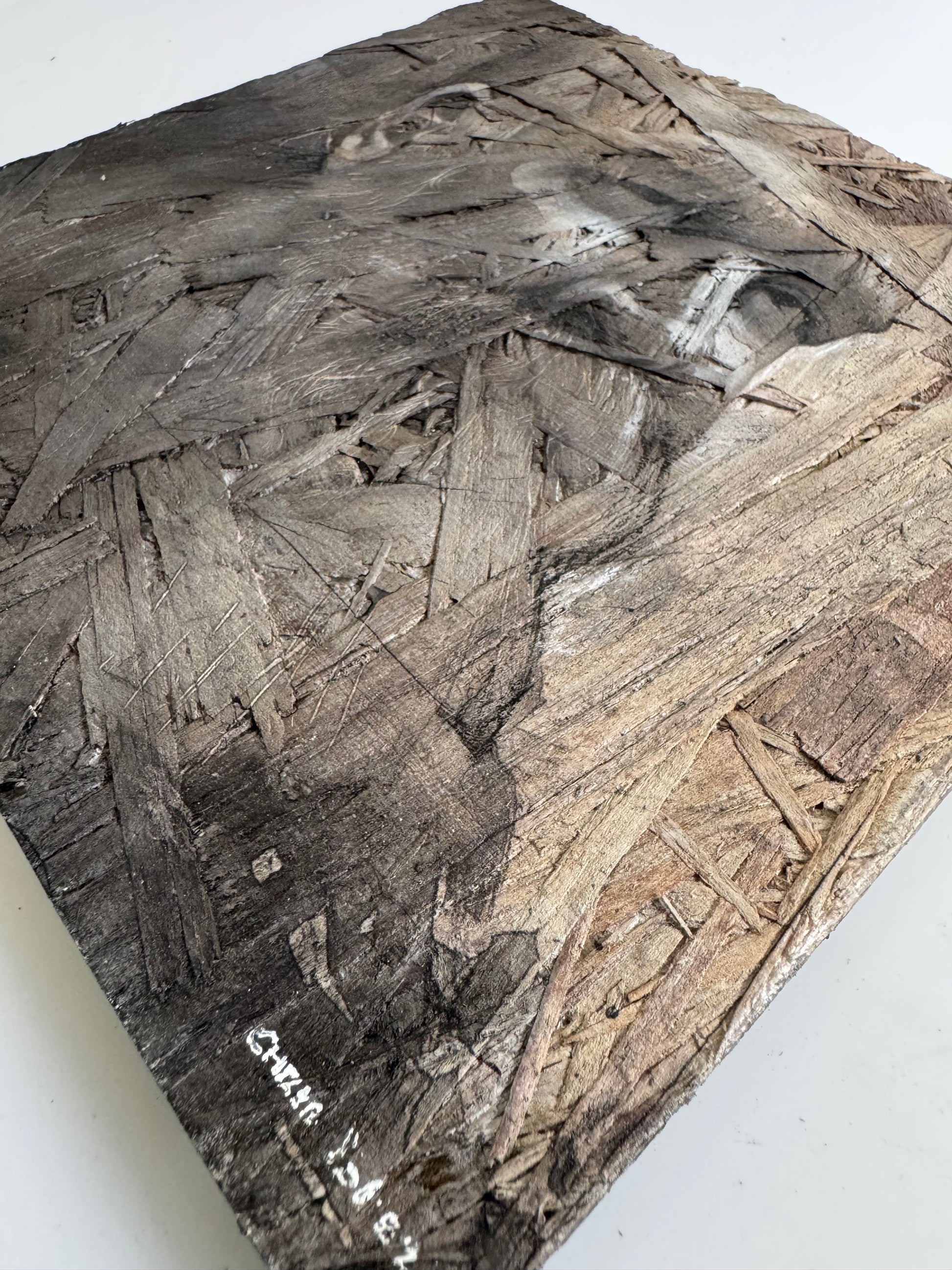 "Self Portrait 3" This 8x8" mixed media piece on OSB panel showcases raw, expressive brushwork that invites tactile exploration. The rough strokes interacting with the natural wood surface create a dynamic texture, offering a unique sensory and visual experience. Ideal for collectors appreciating bold technique and material interplay in art.