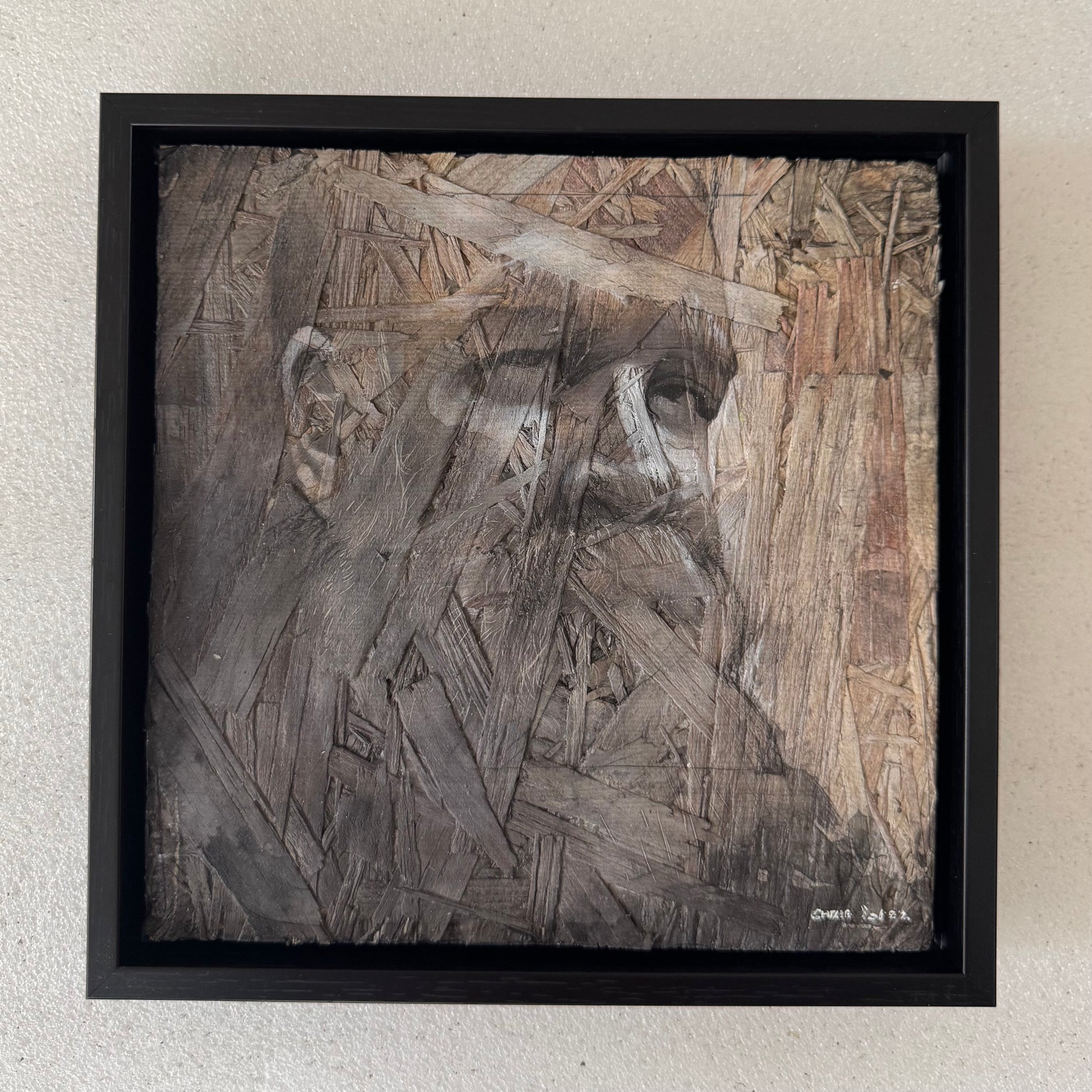 "Self Portrait 3" is a mixed media on a 8x8" OSB panel. Varnished to enhance durability and color vibrancy, the artwork is elegantly framed, making it ready to display. The use of OSB provides a unique textured surface that adds depth and character.