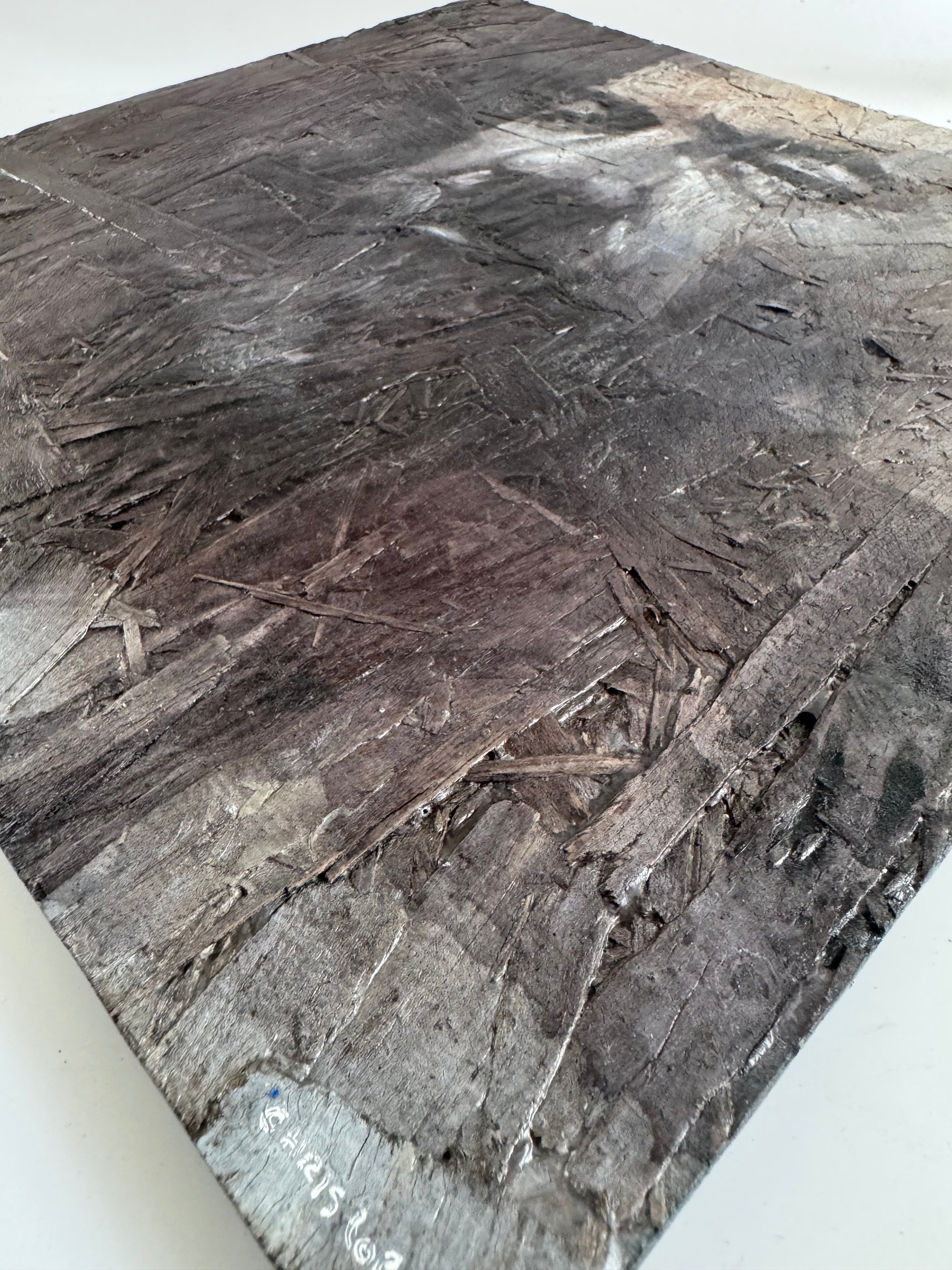 "Presence" This 12x12" mixed media piece on OSB panel showcases raw, expressive brushwork that invites tactile exploration. The rough strokes interacting with the natural wood surface create a dynamic texture, offering a unique sensory and visual experience. Ideal for collectors appreciating bold technique and material interplay in art.