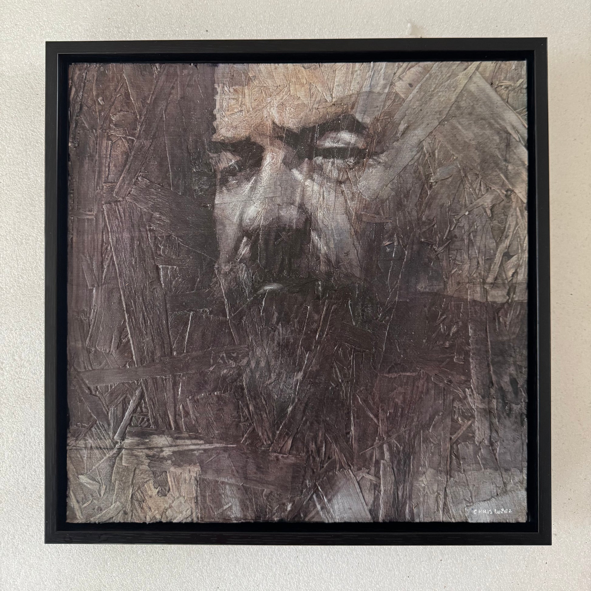 "Presence" is a mixed media on a 12x12" OSB panel. Varnished to enhance durability and color vibrancy, the artwork is elegantly framed, making it ready to display. The use of OSB provides a unique textured surface that adds depth and character.