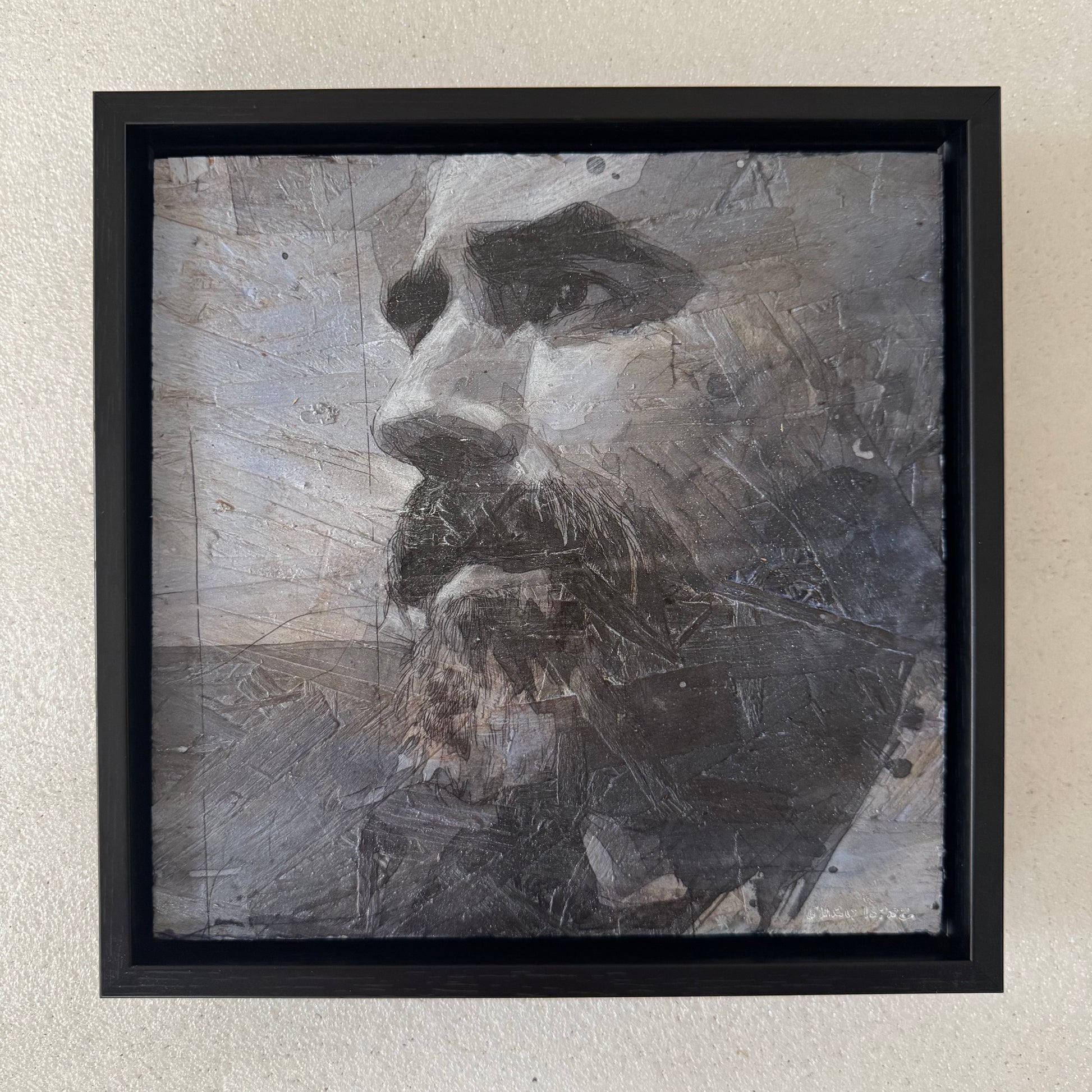 "Presence 2" is a mixed media on a 8x8" OSB panel. Varnished to enhance durability and color vibrancy, the artwork is elegantly framed, making it ready to display. The use of OSB provides a unique textured surface that adds depth and character.