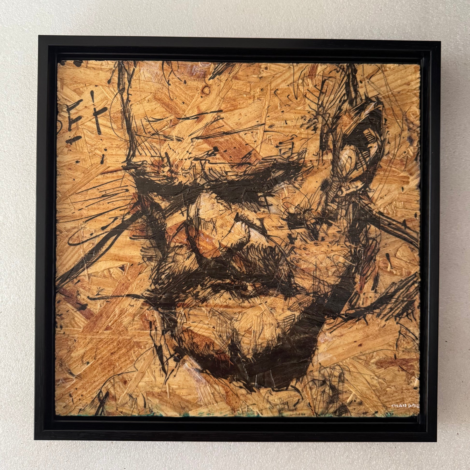 "Rough Study" is a mixed media on a 12x12" OSB panel. Varnished to enhance durability and color vibrancy, the artwork is elegantly framed, making it ready to display. The use of OSB provides a unique textured surface that adds depth and character.