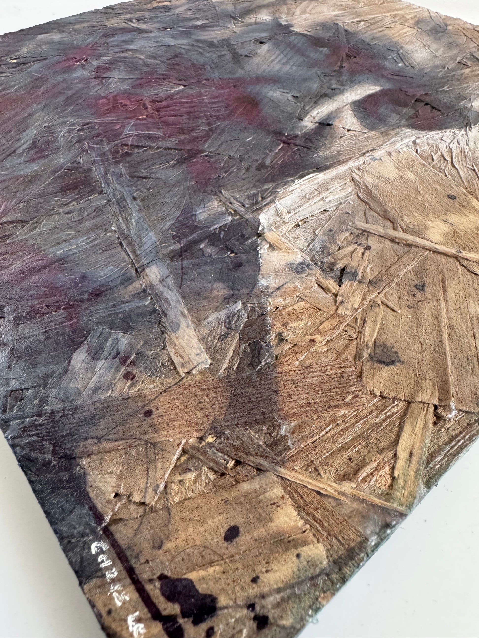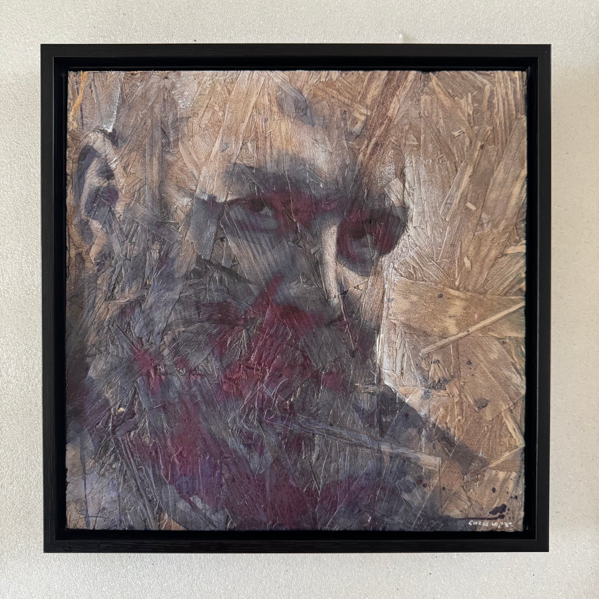 "Self Portrait 1" This 12x12" mixed media piece on OSB panel showcases raw, expressive brushwork that invites tactile exploration. The rough strokes interacting with the natural wood surface create a dynamic texture, offering a unique sensory and visual experience. Ideal for collectors appreciating bold technique and material interplay in art.