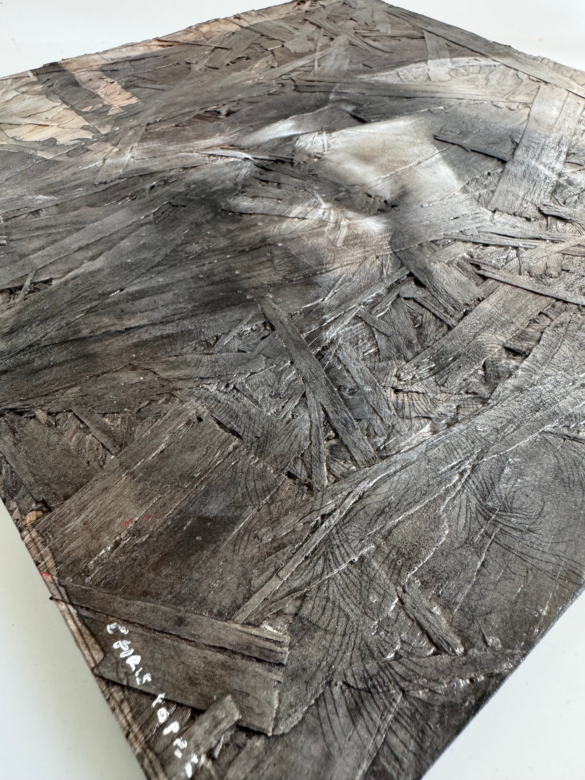 "Self Portrait 3" This 12x12" mixed media piece on OSB panel showcases raw, expressive brushwork that invites tactile exploration. The rough strokes interacting with the natural wood surface create a dynamic texture, offering a unique sensory and visual experience. Ideal for collectors appreciating bold technique and material interplay in art.