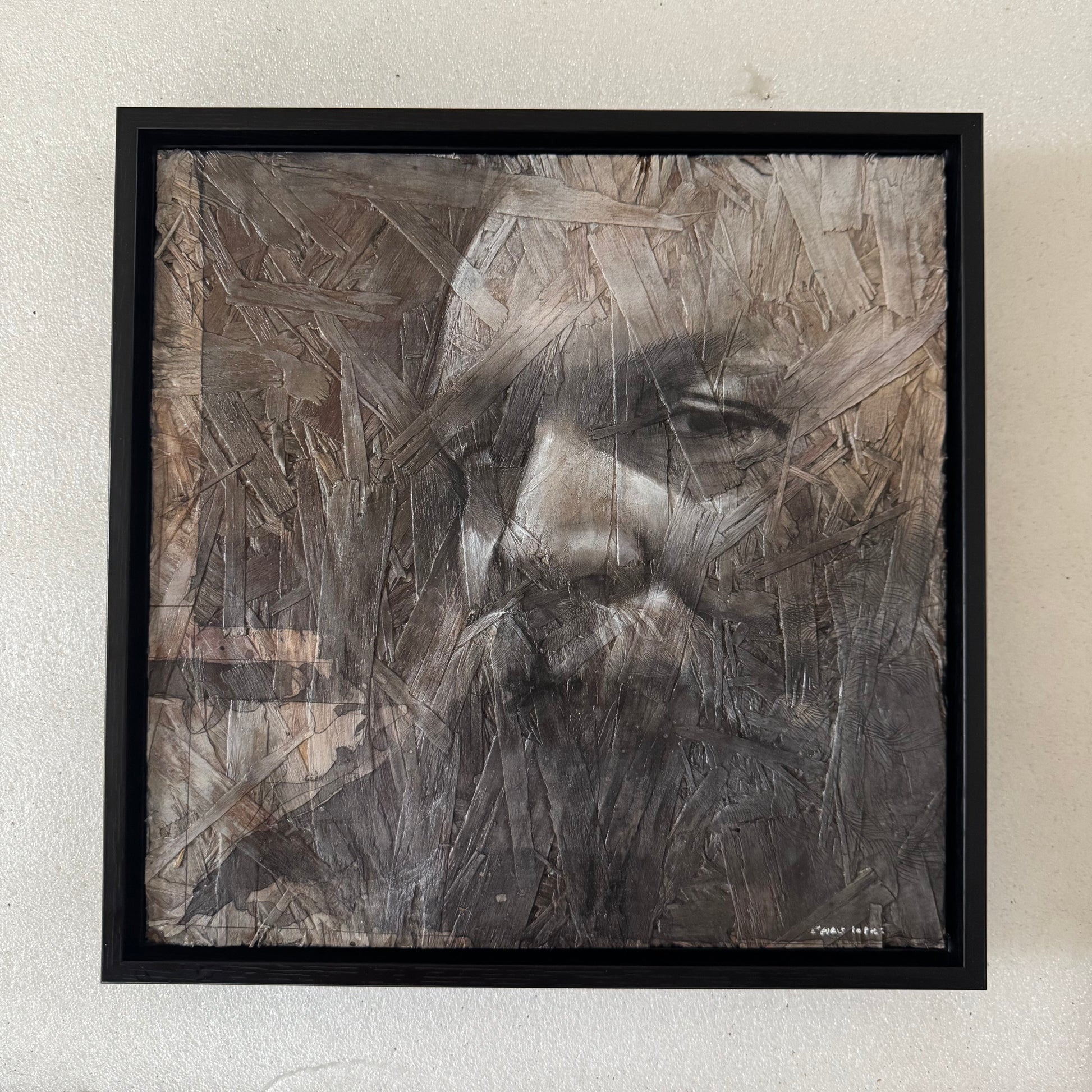"Self Portrait 3" is a mixed media on a 12x12" OSB panel. Varnished to enhance durability and color vibrancy, the artwork is elegantly framed, making it ready to display. The use of OSB provides a unique textured surface that adds depth and character.