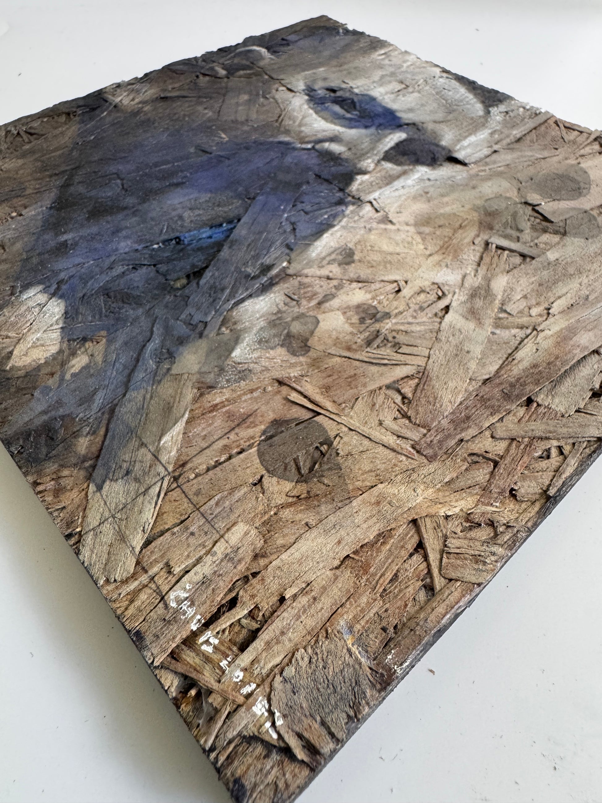 "Self Portrait 4" This 8x8" mixed media piece on OSB panel showcases raw, expressive brushwork that invites tactile exploration. The rough strokes interacting with the natural wood surface create a dynamic texture, offering a unique sensory and visual experience. Ideal for collectors appreciating bold technique and material interplay in art.