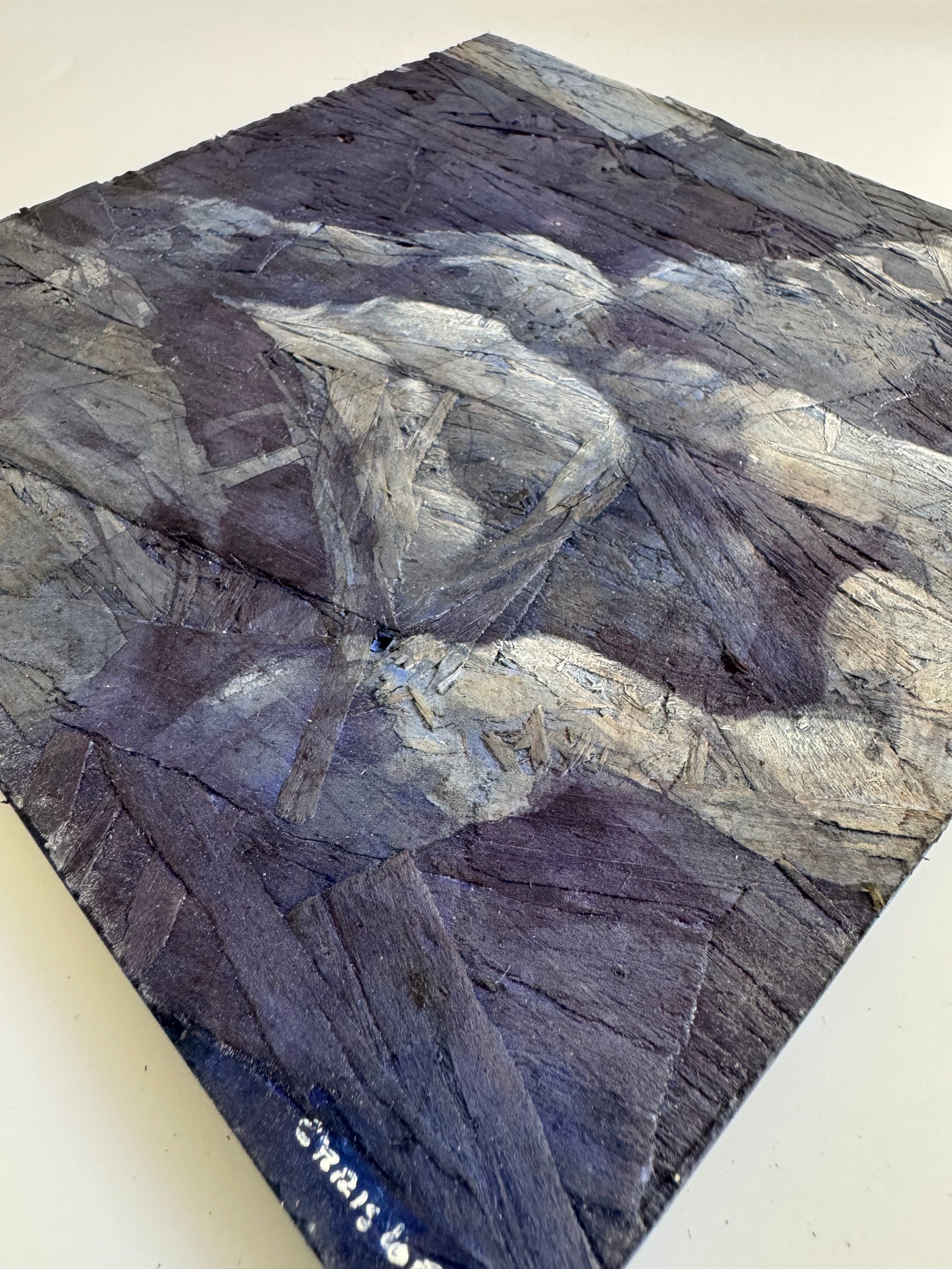 "Lounging" This 8x8" mixed media piece on OSB panel showcases raw, expressive brushwork that invites tactile exploration. The rough strokes interacting with the natural wood surface create a dynamic texture, offering a unique sensory and visual experience. Ideal for collectors appreciating bold technique and material interplay in art.